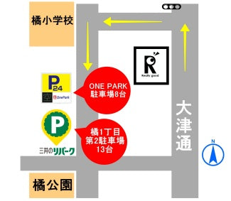 大津通り沿い、 東別院交差点を北へ直進。 下茶屋公園交差点を越えて100mほど先の左手側にございます。 店舗裏側の8台 (ONE PARK駐車場) と13台 (三井のリパーク) のコインパーキングをご利用ください。