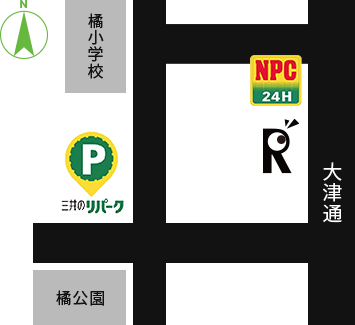 大津通り沿い、 東別院交差点を北へ直進。 下茶屋公園交差点を越えて100mほど先の左手側にございます。 店舗北側に5台 (NPC駐車場) と店舗裏側に13台 (三井のリパーク) のコインパーキングをご利用ください。