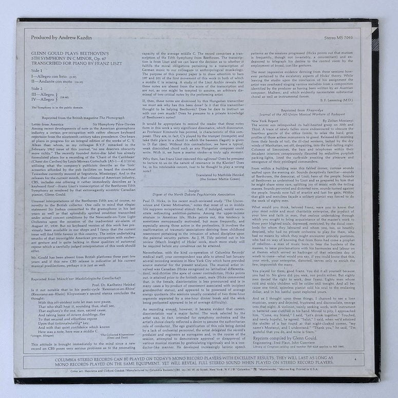 LP/ グレン・グールド / べートーヴェン:交響曲第5番「運命」(リスト編曲ピアノ版) / US盤 オリジナル、2EYE COLUMBIA MS7095